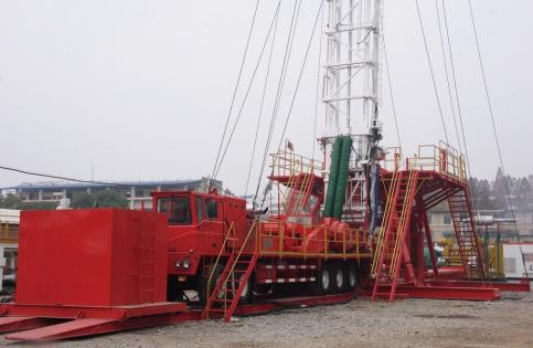 ◆ 柴油機(jī)分動(dòng)箱、絞車和井架放置在自走式底盤車上,用雙節(jié)伸縮式井架,用液缸起升,井架繃?yán)K用地錨固定,配底座或者小修平臺(tái),能夠?qū)崿F(xiàn)修井機(jī)快速移運(yùn)。